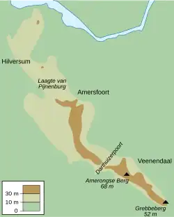 On the southeastern side the ridge rises sharply from the valley of the Nederrijn (Lower Rhine). Here the famous Grebbeberg (Grebbe Mountain) forms a landmark (52 m. high) where the Battle of the Grebbeberg took place in 1940 as an important part of Battle of the Netherlands. The highest peak of the ridge is the Amerongse Berg (Amerongen Mountain) of 68 m. On the northern side the ridge continues to the shores of the Gooimeer (Lake Gooi).