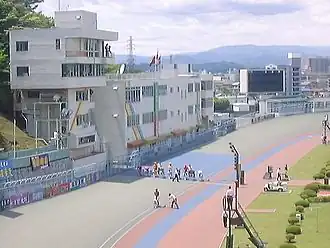 ![]() Utsunomiya Velodrome. The finish line was moved to the other side of the course when construction of the new grandstand was completed in 2009 | |