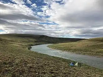 The Utukok River (Iñupiaq: Utuqqaq) is a 225-mile (362 km) long stream in the North Slope Borough of the U.S. state of Alaska.[3] It rises in the De Long Mountains at the confluence of Kogruk and Tupik creeks and flows north, northeast, and then northwest.[1] It empties into Kasegaluk Lagoon on the Chukchi Sea of the Arctic Ocean, 20 miles (32 km) southwest of Icy Cape.[1] It is the breeding ground for Arctic caribou and various birds.[4]
