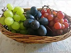 The varieties included in Uva di Puglia PGI are several. Among the white grapes, there are the varieties: Italia, Regina and Victoria, straw yellow-coloured. They have seeds, the pulp is crunchy and, above all the variety Italia has a Moscato flavour. The red variety is the Michele Palieri characterised by a dark colour and a less sweet taste while the pink one, the Red Globe is very sweet and it is perfect for making desserts and jam.[2] The harvesting period starts during the second decade of July for the Victoria and the Michele Palieri and between the third decade of July and August for the other varieties. This product is rich in sugar as glucose and mannose and in mineral salts like potassium, iron and phosphorus. It is also rich in B vitamins and in C and K vitamin.