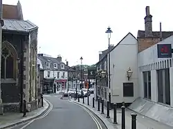 The Chimes shopping centre was built beside Uxbridge station in 2001, incorporating many of the existing buildings into the new structure. The centre was originally to be named St George's Centre in plans dating back to the early 1990s, though this name was eventually taken by another shopping centre in Harrow. Instead, The Chimes was said to refer to the sound of the bells from the nearby market house on the High Street.[38] An Odeon cinema opened as a major part of the centre, with the smaller cinema at the opposite end of the High Street closing.[39] Some houses on Chippendale Way and the St George's car park were demolished to allow for the construction of the new shopping centre car park.[40] The offices of the local building company Fassnidge were also included in the new development; built in the 19th century, they house a Pizza Express restaurant. Preserved timber from earlier demolished buildings in Uxbridge was used in the construction of a new building beside the former offices of Fassnidge, designed to resemble a much older structure.[41]