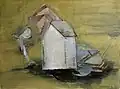 In later years, landscape painting pushed cityscapes and portrait painting to the background. His emerging hearty relationship to Southern Bohemia had a significant influence on this change. The main subject matter of his paintings became the geometrical lines belonging to the village houses' gables. Again and again in never-ending variations he placed blocks and triangles into the magical space of a landscape, out of which he assembled village houses. One can feel a pulsating life behind their walls, but it is hidden, mysterious, often surrounded by a melancholic haze. Having been present to the sad transformation of the traditional village into a heterogeneous hybrid of generic plastering, three-part windows and blocks of flats, he attempted to capture the scenery of stonewalls, baroque gates and dusty paths with flocks of geese, disappearing together with the magic of cleanliness and a feeling of deep belonging to a world of ancient traditions and certainties rising out from the past. His experience of a concrete reality is always supported by a delicate base.