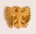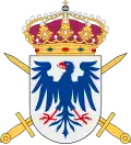 The coat of the arms of the Värmland Regiment (I 2/Fo 52) 1977–1994 and the Värmland Brigade (IB 2) 1994–2000. Blazon: "Argent, the provincial badge of Värmland, an eagle azure, wings elevated and displayed, armed and langued gules. The shield surmounted two muskets in saltire, or".[5] The coat of the arms of the Värmland Regiment (I 2/Fo 52) 1994–2000 and the Värmland Group (Värmlandsgruppen) 2000–2004. Blazon: "Argent, the provincial badge of Värmland, an eagle wings elevated and displayed azure, armed and langued gules. The shield surmounted two swords in saltire, or".[5]