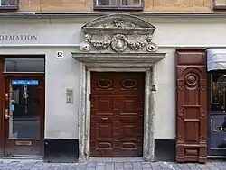 Number 52 was called Sidenhuset Pärlan ("silk house the Pearl") and the portal still features the pear-shaped pearl over the front door which was the owner's mark of the silk trader Henric Meurman. He created a small-ware shop in the 1660s, decorating the portal with fruit garlands and a bow resembling those on the House of Knights, following a common practice for burghers to copy decorations found on prominent palaces.[18]