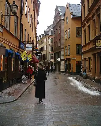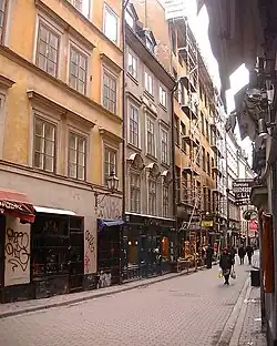 During the 15th century, the street became the paved artery road it still is today, with dwellings and shops on either side. During the Middle Ages and the Vasa era, the southern part of the street formed part of the district centred on Järntorget, at the time the most prominent quarters in the city inhabited by influential merchants such as Mårten Trotzig, Mårten Leuhusen and Erik Larsson von der Linde. Along the rest of the street craftsmen had their small workshops, and the northernmost section, stretching between Mynttorget and Storkyrkobrinken, was called Stadssmedjegatan ("City's Smith's Street"), because the blacksmiths who were confined outside the city because of the danger of fire had their headquarters there. During the 17th century this section was instead inhabited by goldsmiths and accordingly climbed the ranks.[2][3]