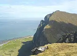An 840 hectares (2,100 acres) area consisting of vertical cliffs and steep grassy slopes on the south-west peninsula of the island, along with the Måstadfjellet nature reserve and adjacent marine waters, has been designated an Important Bird Area (IBA) by BirdLife International because it supports large breeding colonies of about 40,000 pairs of Atlantic puffins and 15,000 to 20,000 pairs of black-legged kittiwakes.[4]