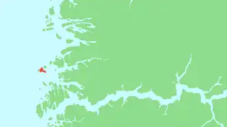 Værlandet is an island in Askvoll Municipality in Vestland county, Norway. The 9-square-kilometre (3.5 sq mi) island lies immediately east of the Bulandet island group. The island of Alden lies about 2 kilometres (1.2 mi) northeast of Værlandet. The island lies about 16 kilometres (9.9 mi) west of the mainland coast of Askvoll, and it is only accessible by boat. There is a regular ferry route connecting Værlandet to the mainland village of Askvoll. There is a series of bridges that connect Værlandet to the islands of Bulandet to the west. Værlandet Chapel is located on the island. In 2001, there were about 200 residents on the islands.[1] The Værlandet LORAN-C transmitter was located on the island, but demolished on 19 Sep 2017.
