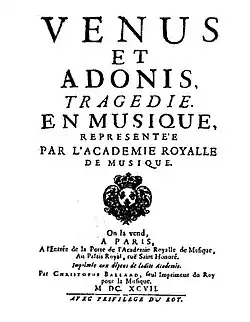 Vénus et Adonis was Desmarets' eighth stage work and his third to be premiered at the Académie Royale de Musique. Between 1695 and 1697, Desmarets was working simultaneously on Vénus et Adonis, Les festes galantes (an opéra-ballet), and another five-act tragédie en musique, Iphigénie en Tauride. Vénus et Adonis was the first of the three to premiere, and according to the French musicologist Jean Duron, it was also Desmarets' favourite work.[1] His librettist was Jean-Baptiste Rousseau, who was at the start of his career and only 26 when the opera premiered. The myth of Venus and Adonis as recounted in Book X of Ovid's Metamorphoses held a particular fascination for the poets, artists, and musicians of the Renaissance and Baroque eras and was the inspiration for numerous works. It had been the subject of at least two operas prior to Desmarets and Rousseau's treatment, Mazzocchi's La catena d'Adone (1626) and Blow's Venus and Adonis (1683), as well as Donneau de Visé's play, Les Amours de Vénus et d'Adonis with music by Charpentier (1669). Rousseau's treatment differed in that he added the character of Cidippe, a Cypriot princess, whose unrequited love for Adonis eventually ends in her suicide.[2]
