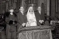 In 1929 and when already a known architect, Eusa married a girl from Pamplona, Florencia Eugui Garro (1906-2009). She was descendant to another local bourgeoisie family.[15] Her father ran a sugar mill in the Cuatro Vientos district[16] and later developed it into the alcohol and vinegar business;[17] he also served as councilor in the Pamplona town hall.[18] The marriage proved to be lasting and happy; Florencia was ingenious and resourceful, which allowed Víctor to focus on architecture.[19] The couple lived in the Eusa family house at the central Pamplonese calle Estafeta[20] and had 4 children, born between 1930 and 1940: Carmen, María Jesús, Isabel and Miguel Angel Eusa Eugui.[21] None of them became a public figure. Neither Víctor's grandchildren are known nationally, though Reyes Marquiegui Eusa tried her hand as translator of juvenile literature.[22] The Eusa branch is likely to extinguish; Víctor's son has only female descendancy.[23]
