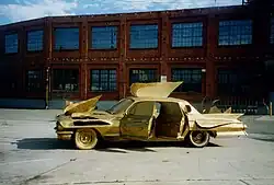 A significant three-dimensional work Cadillac–Icarus was created by Vũ Dân Tân in 1999 during his art residency at the Pacific Bridge Gallery, Oakland, CA. The artist recycled a real Cadillac 1961 into a sculpture and painted it gold.[25] In 2000, Pacific Bridge Gallery took the initiative to ship Cadillac–Icarus to Vietnam and to shoot a film about its journey (film “Icarus – the Art of Vu Dan Tan”, dir. Nicholas Brooks).