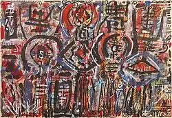 Drawing and painting develop periodically from the middle 1970s till the end of the artist’s life. The diverse figurative and abstract paintings of the 1980s give way to the voluminous Festival banners series (1989-1994) sporadically produced during six years these gouaches on traditional dó paper and newspapers introduce an unknown but inclusive iconographic language which comprises images resembling Chinese characters, patterns of minority’s textiles, Christian motifs and shamanistic masks and banners. These emblems reference to village life and social practices that may contradict still-prevailing political edicts.[13]