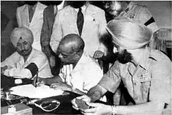 V.P. Menon was present at the meeting between Lord Mountbatten and Hanwant Singh, Maharaja of Jodhpur. It was at this meeting that Hanwant Singh signed the instrument of accession to India. After he had signed and the Viceroy Mountbatten left, only Menon was in the room with him. The Maharaja took out a .22 calibre pistol and pointed it at Menon and said 'I refuse to take your dictation'. Menon told him that he would be making a very serious mistake by threatening him and would not be able to get the accession abrogated in any case.[9]