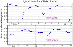 ![]() Visual band light curves for V1094 Scorpii, adapted from Wichmann et al. (1998)[1] and Joergens et al. (2001)[2] | |