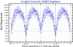 V3903 Sagittarii varies in brightness. The General Catalogue of Variable Stars lists it as a possible hot irregular Orion variable star, but it has been shown to be a detached eclipsing binary system. The two stars are detached, that is they do not fill their roche lobes, which makes it an Algol-type eclipsing variable. The period is one day, 18 hours, 52 minutes.[11][6]