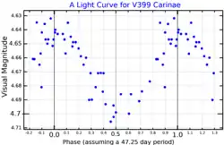 V399 Carinae has long been suspected to be variable.[18] A 1981 study of yellow supergiants fit observations to a Cepheid-like light curve with a period of 58.8 days, although the luminosity and spectral type do not place the star near the Cepheid instability strip.[15] It was listed in the General Catalogue of Variable Stars as a possible δ Cep variable.[19] Further observations refined the period to 47.25 days.[6] The Hipparcos catalogue classified V399 Car as a semiregular variable with a period of 88 days and a mean amplitude of only 0.04 magnitudes.[20] An automated classification from Hipparos photometry suggested it is an α Cygni variable.[21] The observed brightness varies from magnitude +4.63 to +4.72.[2]