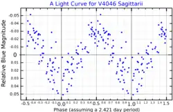 V4046 Sagittarii is a young binary consisting of two K-type main-sequence stars. The two stars are about 271 light-years (83 parsecs) away from the Earth.[4] The two stars orbit each other every 2.42 days on a circular orbit.[4]