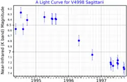 V4998 Sgr's high mass compresses its core and accelerates fusion primarily by the CNO cycle which leads to a luminosity of about 4,000,000 L☉ and a temperature of 12000 K. It boasts a large ejection nebula with a diameter of about 0.8 parsec (2.5 ly) and a mass of 6.2 M☉.[4] Since comparable nebulae typically last no more than 10,000 years, V4998 Sagittarii is presumed to have undergone a massive eruption 5000-10,000 years ago.[4]