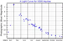 V500 Aquilae also known as Nova Aquilae 1943 was a nova which appeared in the constellation Aquila, very near the star Altair, in 1943. It was discovered by Cuno Hoffmeister on photographic plates taken at Sonneberg Observatory on 5 September 1943, when it had a photographic magnitude of 12.[4] It reached its peak brightness sometime between 13 April 1943 when it was fainter than photographic magnitude 13.5, and 2 May 1943 when its photographic magnitude was 6.55 (6.1 visual magnitude).[2]
