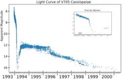 The light curve of V705 Cassiopeiae showed a very pronounced "dust dip", and its brightness fell to about 16th magnitude in mid March 1994, before rebounding to about magnitude 12.5 where it stayed for about two years, after which it declined further. This dust dip occurs when dust forms as the material ejected in the nova explosion expands and cools.[8] The nova ultimately faded to a quiescent magnitude of 16.4.[3]