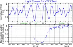 ![]() Light curves for V773 Tauri. The upper panel shows the variability as seen by TESS.[1] The lower panel, adapted from Kenworthy et al.,[2] shows the eclipse seen in 2010. | |
