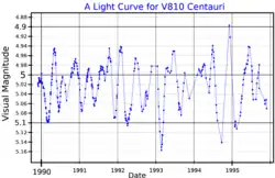 Maurice Pim FitzGerald announced that the star's brightness varies, in 1973.[8] It was given its variable star designation, V810 Centauri, in 1979.[9] V810 Cen A shows semi-regular variations with several component periods. The dominant mode is around 156 days and corresponds to Cepheid fundamental mode radial pulsation. Without the other stellar pulsation modes it would be considered a Classical Cepheid variable. Other pulsation modes have been detected at 89 to 234 days, with the strongest being a possible non-radial p-mode at 107 days and a possible non-radial g-mode at 185 days.[1]