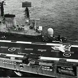 From 4 May through 15 November 1968, VA-46 transitioned to the A-7 Corsair II.[2] On 17 September 1970, while en route to the Caribbean for training exercises on board USS John F. Kennedy, they received emergency orders to deploy immediately to the Mediterranean due to the hijacking of four airliners by members of the Popular Front for the Liberation of Palestine. They remained on station off the coast of Israel until November. During October 1973, with the outbreak of the Yom Kippur War between Israel, Egypt and Syria, John F. Kennedy and her air wing, while operating in the North Atlantic after just completing a Mediterranean deployment, were ordered back to the Mediterranean. During the latter part of October through mid-November, VA-46 conducted flight operations while the carrier was on station south of Crete. On 22 November 1975 during night operations, John F. Kennedy collided with USS Belknap, causing major damage to the cruiser. Eight VA-46 personnel received awards for their heroism and devotion to duty as a result of their actions following the collision.[2]