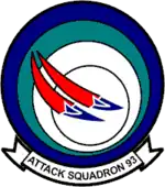 VA-93 was an Attack Squadron of the U.S. Navy. It was established as Fighter Squadron VF-93 on 26 March 1952, and redesignated as VA-93 on 15 September 1956. It was disestablished 30 years later on 31 August 1986. The squadron's nickname was the Blue Blazers from 1954 to 1976 and the Ravens thereafter.[1]
