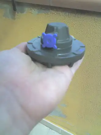 The VAR/40 is a small landmine, designed to be carried by individual soldiers and hand laid. It was initially produced for the Italian army in the 1970s, and was exported to a large number of countries. The mines body is circular with a ribbed plastic body split into upper and lower halves. The upper half holds the pressure-sensitive fuze mechanism, which is covered by a truncated rubber cone. The fuze is covered by a safety cap that prevents accidental activation. The safety cap also has a threaded well, which holds the detonator during transit.