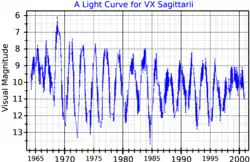 - ^ a b c d Lockwood, G. W.; Wing, R. F. (1982). "The light and spectrum variations of VX Sagittarii, an extremely cool supergiant". Monthly Notices of the Royal Astronomical Society. 198 (2): 385–404. Bibcode:1982MNRAS.198..385L. doi:10.1093/mnras/198.2.385. ISSN 0035-8711.