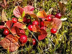 Vaccinium praestans is a hardy plant that can grow in harsh cold climates. However, it requires shelter from strong winds and needs insulation from snow and leafs to protect its roots in freezing temperatures. It is best suited for slightly sandy, loamy soils. It also prefers moderately moist, mesic soils with a high acidity, ranging in PH from 4.5 to 6.[8] It can quickly become chlorotic if lime is present in the soil, which means it won't produce enough chlorophyll and its green leaves will become a pale yellow to yellow-white color.[9][10] It also does not like root disturbances or stagnant water at the roots, preferring moist, yet well drained soils but can not tolerate drought.[1] The plant can grow in semi-shady conditions, but fruits best when in full sunlight.
