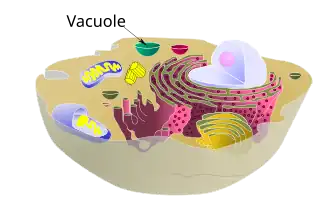 A vacuole (/ˈvækjuːoʊl/) is a membrane-bound organelle which is present in plant and fungal cells and some protist, animal, and bacterial cells.[1][2] Vacuoles are essentially enclosed compartments which are filled with water containing inorganic and organic molecules including enzymes in solution, though in certain cases they may contain solids which have been engulfed. Vacuoles are formed by the fusion of multiple membrane vesicles and are effectively just larger forms of these.[3] The organelle has no basic shape or size; its structure varies according to the requirements of the cell.