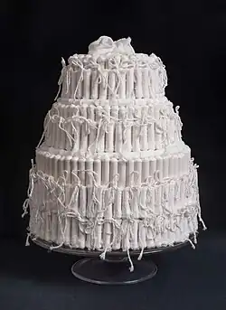 During her years in New York, Turner manipulated domestic and feminine materials so that they would defy behavioral expectations and speak in new ways. Her "early practice involved making confrontational sculptures from nontraditional items, such as wax paper lingerie and a tampon wedding cake, in a vein similar to that of feminist artists during the late 1960s and ’70s."[7]