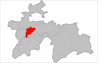 Vahdat District (also spelled Vakhdat (Russian: Вахдатский район),[a] Tajik: Ноҳияи Ваҳдат, romanized: Nohiyayi Vahdat) is a former district of the Districts of Republican Subordination in Tajikistan, called Kofarnihon District until the introduction of a new administrative division in the end of 2003. During the Soviet period it was named Ordzhonikidzeabad district in honor of Georgian communist Grigoriy Ordzhonikidze. It extends east of Dushanbe along the southern slopes of the Gissar Range, bordering on Varzob District from the west and Rasht District from the east. Its long southern border runs (from west to east) along Khatlon Province and then Faizobod, Roghun, and Nurobod districts. The district capital Vahdat (formerly Ordzhonikidzeabad) is placed off-center at the extreme southwest of the district, just 10 km east of Dushanbe.[1] Around 2018, the district was merged into the city of Vahdat.