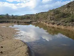 The valley in which the forest exists drops from about 9 m (30 ft) to 0 at the waterline. Within it an intermittent stream emerges from the northern hill and flows down to a wetlands, providing just the amount of water required for the trees.