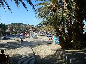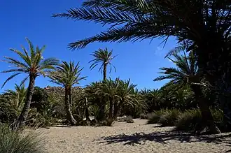 Vai (Greek: Βάι),[ii] Greek for "palm",[2][iii] is a region of east Crete between Cape Sidero and Cape Plaka, just south of the site of ancient Itanus but north of the villages that surround and are part of Palaikastro. Vai does not belong to them nor is it part of any civic unit of the local civic division of Greece. It is not itself an official village.[iv] The region is somewhat isolated on the isolated northeast peninsula, connecting only to Eparchos odos moni Toplou, the only road between Palaikastro and Toplou Monastery.[v] The entire distance is essentially trackless and deserted, as the name of one of the beaches at Itanus suggests, Eremoupolis, "deserted city".