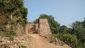 The fortress lies north of the village spread over a 10-acre (4.0 ha) area. There are three gates at the entrance of the fort. A river moat (Khandak) nearly 15 to 20 feet (5 to 6 m) deep runs around the fort. There are many wells inside the fort. The step well with two arches, still containing water, is in a ruined state. there are two rectangular wells with large stone coverings. Presently the Archeology dept artment has taken up work of reconstruction of the main entrance. Outside the fort proper is the tomb of the Gond Prince Durga Sah and a grave of unknown English Girl who is believed to be the daughter of a British commandant of the garrison between 1818 and 1830.[2]