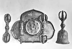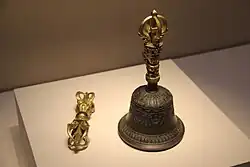 The vajra is almost always paired with a ritual bell called a ghanta. The Tibetan term for the ritual bell used in Buddhist religious practices is "dril bu" (འབྲིལ་བུ).[21] Priests and devotees ring bells during the rituals. Together these ritual implements represent the inseparability of wisdom and compassion.[22]