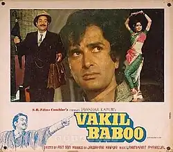 Vakil Baboo is a 1982 Hindi film, produced by Jawahar Kapoor and P. K. Luthra and directed by Asit Sen.[1] The film stars Raj Kapoor alongside his younger brother Shashi Kapoor and also features Zeenat Aman, Rakesh Roshan, Rehman, Aruna Irani, Kader Khan. This was Raj Kapoor's last leading film role and was also the first and only time he appeared onscreen along with his brother Shashi Kapoor, not counting Aag and Awara, wherein Shashi Kapoor appeared as a child actor.