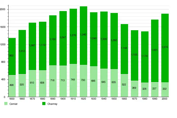 Val-de-Charmey has a population (as of December 2020) of 2,548.[9] As of 2016, 16.8% of the population are resident foreign nationals. In 2015 a small minority (136 or 5.6% of the population) was born in France.[10] Over the last 6 years (2010-2016) the population has changed at a rate of 11.65%. The birth rate in the municipality, in 2016, was 7.4, while the death rate was 16.9 per thousand residents.[8]
