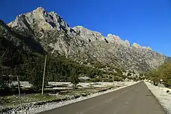 The Valbona Valley (Albanian: Luginës së Valbonës) is in the Albanian Alps in northern Albania. It is part of Alps of Albania National Park, one of the most impressive and notable topographic features of Albania. Being the southernmost continuation of the Dinaric Alps, it forms a section of the Alpine-Himalayan orogenic belt, which extend from the Atlantic Ocean to the Himalaya Mountains.[2] The mountains are characterized by limestone and dolomite rocks and shows major karst features.[3] Maja Jezercë sprawls to the west of the valley and is the highest mountain of the Dinaric Alps, with an altitude of 2,694 m (8,839 ft). The Valbona River originate from several karst springs along the south of Maja Jezercë and the east of Valbona Pass. It is the largest river within the Albanian Alps and drains the entire eastern portion of the range.[4] Over the past few million years, glaciers have at times covered most of the park. During the Würm period, the glacier of Valbona reached a total length of 9.5 kilometres.[5] Nowadays, there are two very small active glaciers close to the northeastern edge of Maja Jezercë.