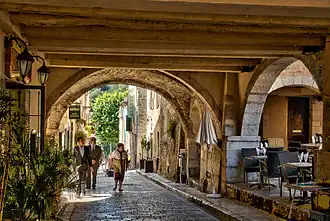 The architecture of the houses of Valbonne is as rigorous as the street layout (see History above). Originally, they were all identical. The ground floor was for deliveries (these are now found half-underground due to a rise in the level of the street). On the first floor was the living room, above, the bedrooms. Finally, the attic, where stores were hoisted up with the aid of a pulley (some examples of these can still be found).