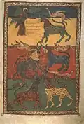 The Beato of Valcavado is an illuminated manuscript—copies of the Commentary on the Apocalypse of Saint John of Beatus of Liébana—copied by a monk called Oveco in the year 970, in the now-vanished Our Lady of Valcavado monastery in Palencia.[1] It is held in the collection of the Santa Cruz Palace, University of Valladolid.[2]
