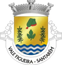 In the beginning of the 20th century, Vale de Figueira was very rich in the production of olive oil with six olive oil mills working altogether. This is why the olive tree leaves are represented in its coat flag, along with the fig tree leave and the campino's hat, all above the blue and silver lines that symbolise the rivers Alviela and Tagus.