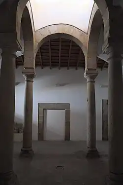 Evidence including metal remains and a 13th-century Portuguese coin indicate that the building was first used as a forge. Another Portuguese coin from the mid-15th century in the foundation of the columns indicates that the building was likely first used as a synagogue around that time; the deteriorating political conditions for Jews in the Crown of Castile meant that a position on the border with Portugal was preferred in case of needing to flee. Its use was brief, as the Alhambra Decree was issued in 1492, expelling all Jews from the realm.[2]: 312