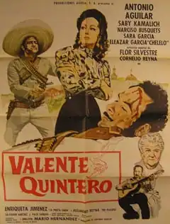 Valente Quintero is a 1973 Mexican historical drama film directed by Mario Hernández and starring Antonio Aguilar (who also co-wrote and produced the film) in the title role.[1] Saby Kamalich, Narciso Busquets, Sara García, Eleazar García, and Cornelio Reyna also star. The supporting cast includes Enriqueta Jiménez and Alejandro Reyna, among others. Flor Silvestre appears in a special musical performance.[1]