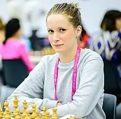 Valentina Golubenko (Russian: Валентина Голубенко; born 29 July 1990)[1][2] is a Russian-born chess player playing for Estonia and Croatia, holding the FIDE title of Woman Grandmaster (WGM). She was world champion in the girls under 18 category in 2008.[3] Although she spent her early life playing in Estonia, Golubenko had moved to Croatia as she was not qualified to represent Estonia owing to her Russian citizenship.[3][4][5]
