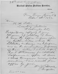 McGillycuddy was appointed as Indian Agent in 1879, when he was 30. He served at the Pine Ridge Agency (now Pine Ridge Indian Reservation in South Dakota). He did not manage to achieve such friendly relations here as he had with Crazy Horse and other Lakota. Red Cloud, a major chief, accused McGillycuddy of mismanagement, leading to several investigations of the Agent's administration. Despite this, McGillycuddy established an Indian police force, and set up a boarding school to educate Indian children of the region. However, persistent claims followed him of tyranny, fraud and the graft typical of the 'Indian Ring',[7] including one in the Boston Advertiser claiming that he had been in receipt of annuities for 2,600 more people than actually lived at Pine Ridge, a loss to the Government of $284,700.[8] Ostensibly under pressure to fire a loyal clerk for no reason he could see, McGillycuddy eventually resigned his post.[6] He was suspended from his position in October 1882 (see letter above).