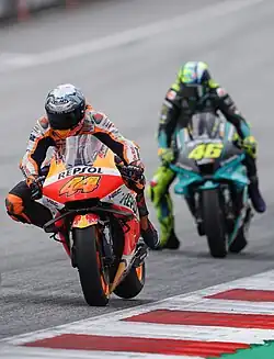 After graduating to the premier class in 2000, Rossi won the final 500cc World Championship (becoming the last satellite rider to win the top-class title until Jorge Martín in 2024) and the Suzuka 8 Hours race with Honda in 2001. He also won MotoGP World Championships with the factory Repsol Honda team in 2002 and 2003 and continued his run of back-to-back championships by winning the 2004 and 2005 titles after leaving Honda to join Yamaha. He lost the 2006 title with a crash in the final round at Valencia. In 2007, he ultimately finished third overall, before regaining the title in 2008 and retaining it in 2009.[5] After a 2010 season marred by a broken leg and no title defense, he left Yamaha to join the Ducati factory team, replacing Casey Stoner for the 2011 and 2012 seasons, and endured two winless seasons with the Italian marque.[6][7]