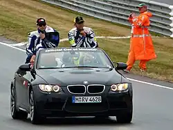 Rossi scored three pole positions in the next three races and finished second in France after battling with Gibernau, who overtook him on the last lap.[72][73] He won in Italy and came second again in Catalunya.[74][75] He took two third-place finishes in the Dutch and British rounds – the latter the result of a ten-second penalty for overtaking under yellow flags, which gifted victory to Max Biaggi in the process – and another second place in Germany, once again battling Gibernau who denied him victory with just 0.060 seconds separating both when they crossed the finish line after a titanic battle between the two.[76][77][78]