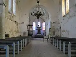 The interior of the church is characterised by the whitewashed high domed vaults. The baptismal font is one of the most notable features of the church. It is one of the oldest pieces of carved stonework in Estonia. Scholars believe that it was made for Haapsalu Cathedral but somehow later found its way to Valjala. The font is richly decorated with expressive Romanesque sculptures, similar to what can be found e.g. in the northern portal of Riga Cathedral. It is believed that the artist both here and in Riga is the same, probably Westphalian, master carver.[2]